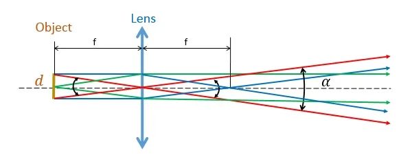 Effect of non-infinitesimal radiant Object placed at focal point of the lens. According to paraxial approximation: Rays divergent from focal point (in green) will travel parallel to optical axis after the lens, Rays traveling parallel to optical axis (in blue) will pass through the focal point on the right side, Rays passing through center of the lens (in red) will continue without refraction. The non-infinitesimal size of the object will cause the output rays to divergent at full angle α