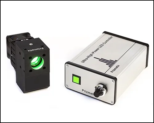 Prizmatix UHP-F-LED series of Ultra High Power LED (up to 70Watt) light guide coupled light sources was designed especially for routine microscopy and OEM illumination applications in life science instrumentation, confocal microscopy and many others. The UHP-F-LED housing is self-contained light source including all necessary driver electronics and thermal management, no special controller box is required to operate the module if used at maximum power.