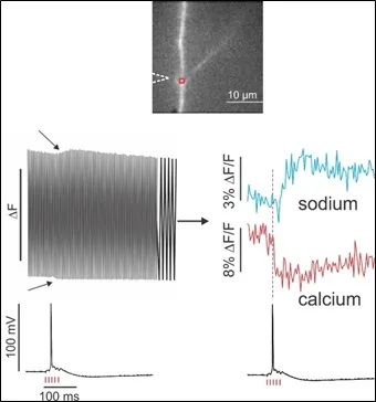To image calcium and sodium simultaneously, the researchers loaded calcium and sodium fluorescence indicators into a single neuron and then quickly switched between the excitation wavelengths for each indicator at 500 Hz. The use of LEDs to provide the excitation light was advantageous because they could be turned on and off instantaneously without a shutter, which cannot respond this fast and can introduce vibrations. To take full advantage of the fast LED switching, the researchers synchronized it to the frame rate of their high-speed camera. “This rapid switching let us alternately illuminate different indicator dyes very rapidly,” said Ross.