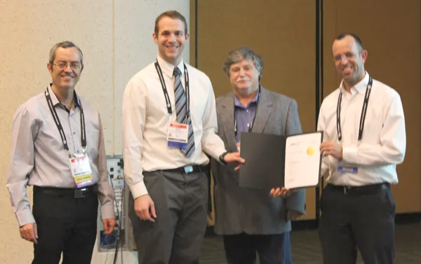 On hand to present the award were conference chair Prof. Dror Fixler of Bar-Ilan University (far left), Prof. Dan V. Nicolau McGill Univ. (second from right), Dr. Assaf Deutsch, Prizmatix Ltd. CEO (far right) and prize winner Mr. Kenny Squire, Oregon State Univ. paper number 10506-19.