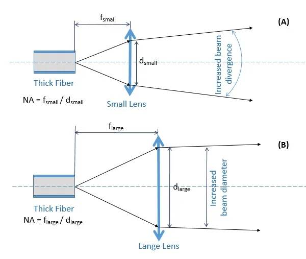 In order to reduce divergence angle of the collimator output beam, larger size lens with same NA as the optical fiber is required. This will result in increase of the output beam diameter. (A) Small size lens, (B) Large size lens. Both lenses have same NA.